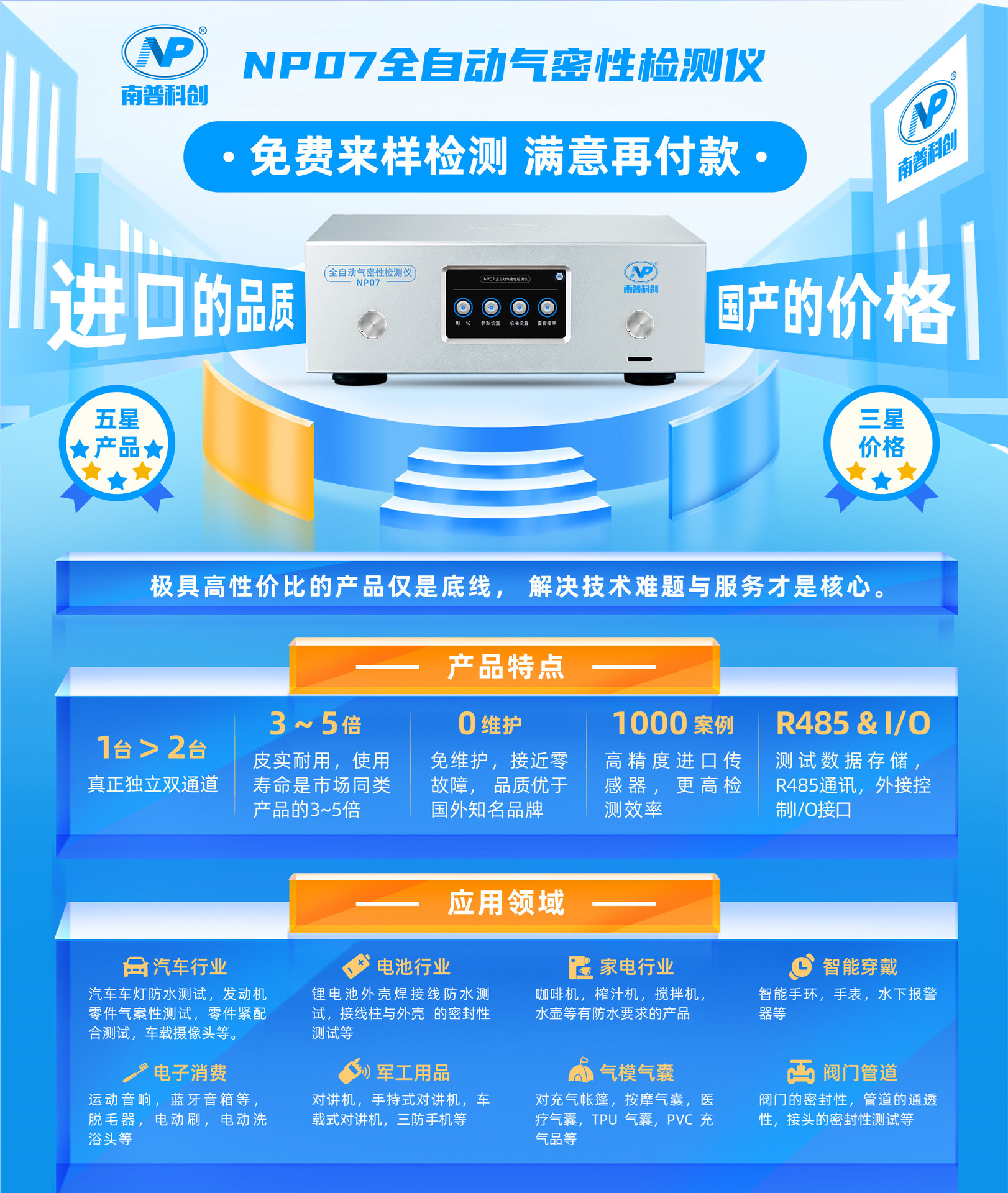 主要應(yīng)用于:電子產(chǎn)品(電動牙刷,電動美容產(chǎn)品,監(jiān)控攝像頭,手表,手機,戶外用品,行車記錄儀,IP67/68防水電子產(chǎn)品),醫(yī)療類(血壓袖帶,呼吸管,呼吸閥,麻醉氣囊,插喉管,過濾閥,滴夜管,藥品包裝),戶外燈,戶外屏,氣模氣囊類(防水透氣膜,按摩氣囊,TPU氣囊,PVC充氣玩具,PVC充氣產(chǎn)品,PVC充氣游泳圈),氣泵,氣閥,電磁閥,水泵,汽車水泵,金屬焊接件(管件,高壓鍋,水壺等),容器類(水箱,油箱,發(fā)動機,各種容器),等防水測試,氣密性測試,無損檢漏,測漏。