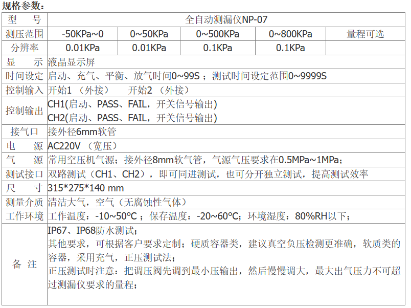 2021新升級 全自動測漏儀NP07 血壓帶測試 產(chǎn)品優(yōu)勢: 1、全自動、智能檢漏;員工操作簡單,參數(shù)設(shè)置方便; 2、正壓測試,或真空檢漏(負(fù)壓,自帶真空系統(tǒng),只需接入氣源); 3、雙路測試,相當(dāng)于2臺測試儀,可同步或獨(dú)立測試2個(gè)產(chǎn)品; 4、使用壽命長,質(zhì)量皮實(shí)耐用,使用壽命是市場同類產(chǎn)品3~5倍; 5、外接控制,可與自動化設(shè)備連接; 6、測試結(jié)果,聲光報(bào)警,并可外接聲光報(bào)警; 7、可測試IP67、IP68防水測試,微壓測試,高壓測試; 8、廠家供應(yīng),量程可選擇,特殊可定制!