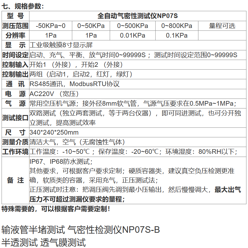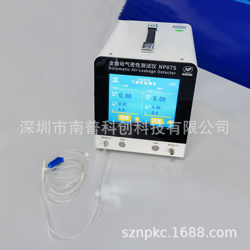 全自動(dòng)氣密性測(cè)試儀NP07S 一、概述:采用壓降法檢測(cè)原理,以壓縮空氣為介質(zhì)對(duì)產(chǎn)品檢測(cè),是一款無(wú)損檢測(cè)儀器。產(chǎn)品通用性強(qiáng),可檢測(cè)大,中,小泄漏。檢測(cè)精度高,操作簡(jiǎn)單。傳感器方面,采購(gòu)的高精度高穩(wěn)定性進(jìn)口傳感器,保證的測(cè)試的精度; 多功能:工業(yè)級(jí)8寸觸摸屏,集成小型化設(shè)計(jì),測(cè)試數(shù)據(jù)存儲(chǔ),控制信號(hào)輸出,RS485通訊,全自動(dòng)測(cè)試;超高穩(wěn)定測(cè)試性能;雙路測(cè)試,兩路同步測(cè)試(也可獨(dú)立分開(kāi)測(cè)試)兩個(gè)產(chǎn)品,提高生產(chǎn)作業(yè)效率; 二、測(cè)試時(shí)間:?jiǎn)?dòng)時(shí)間、充氣時(shí)間、平衡時(shí)間、測(cè)試時(shí)間、放氣時(shí)間等,時(shí)間可以進(jìn)行設(shè)置; 三、全自動(dòng)版:全自動(dòng)測(cè)試,只需要接電、接氣源即可以測(cè)試使用; 四、實(shí)用性:參數(shù)設(shè)置簡(jiǎn)單,使用方便;聲光報(bào)警,控制輸出(實(shí)現(xiàn)自動(dòng)化控制),測(cè)試數(shù)據(jù)存儲(chǔ),RS485通信等; 五、原理說(shuō)明:本測(cè)試儀利用加氣壓或負(fù)壓(抽真空)原理,測(cè)試氣壓衰減檢漏,真空衰減檢漏,氣閥開(kāi)啟氣壓測(cè)試,對(duì)充氣產(chǎn)品,密封產(chǎn)品等各種形狀的容器進(jìn)行無(wú)損密閉性檢測(cè); 六、應(yīng)用范圍:適用于各行業(yè)有氣密性要求(或防水性要求,IP67、IP68防水測(cè)試)的產(chǎn)品進(jìn)行檢測(cè)試驗(yàn)(如:充氣產(chǎn)品,安全氣囊、閉氣產(chǎn)品,閥門(mén)、波紋管、管理氣路、焊接件、壓鑄件、智能手表、水壺、三防電子產(chǎn)品等)。