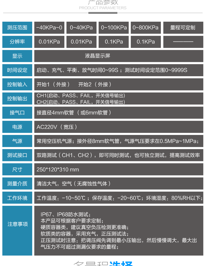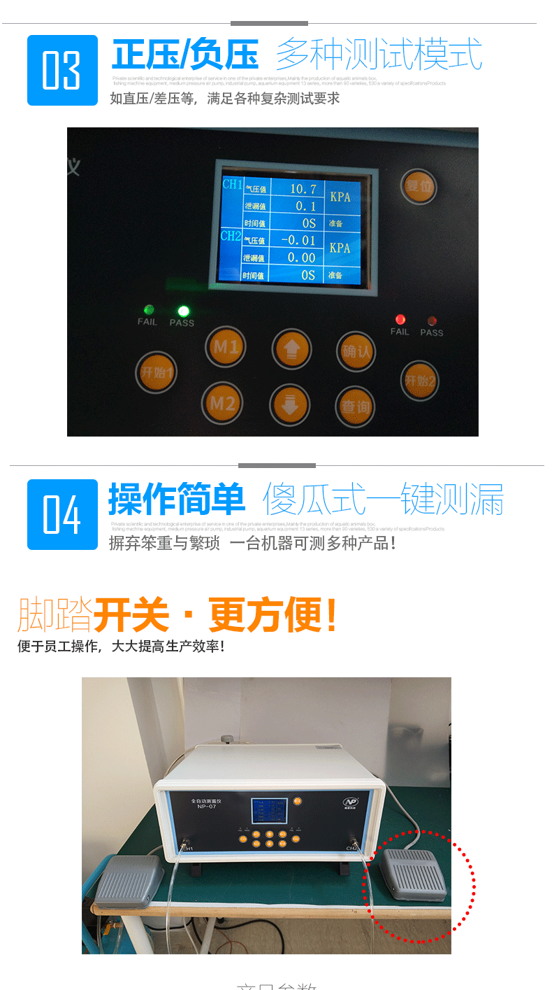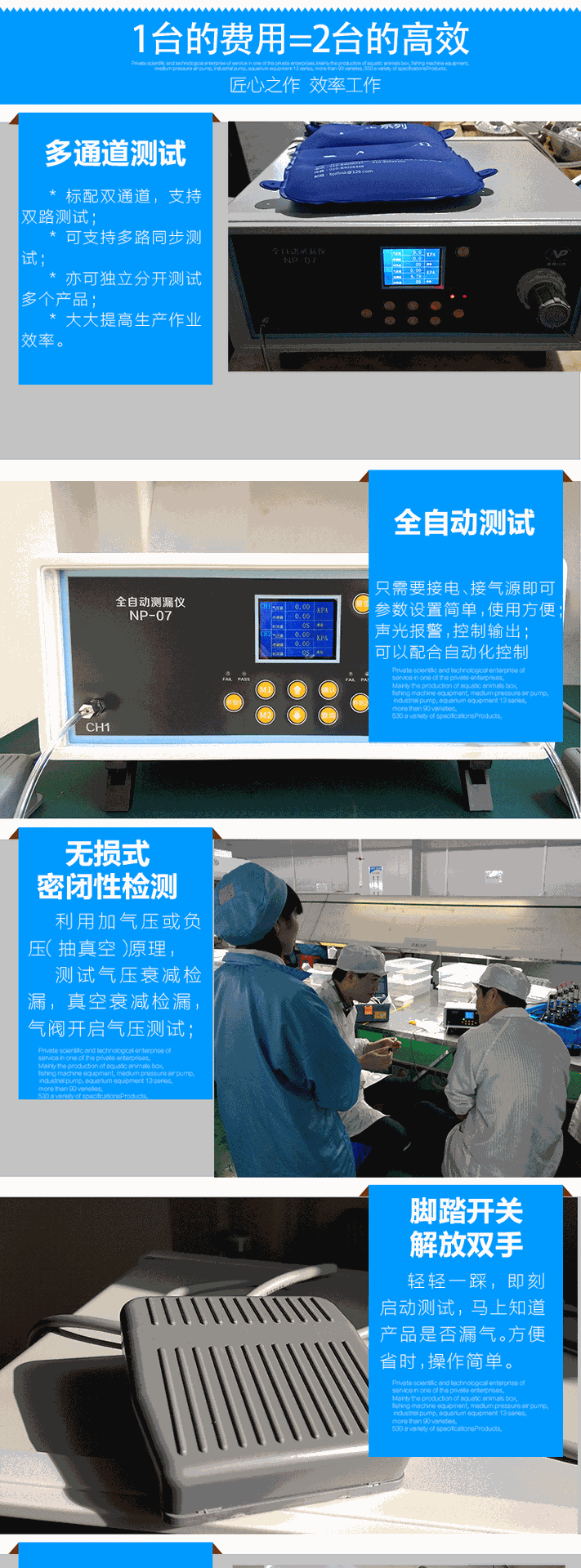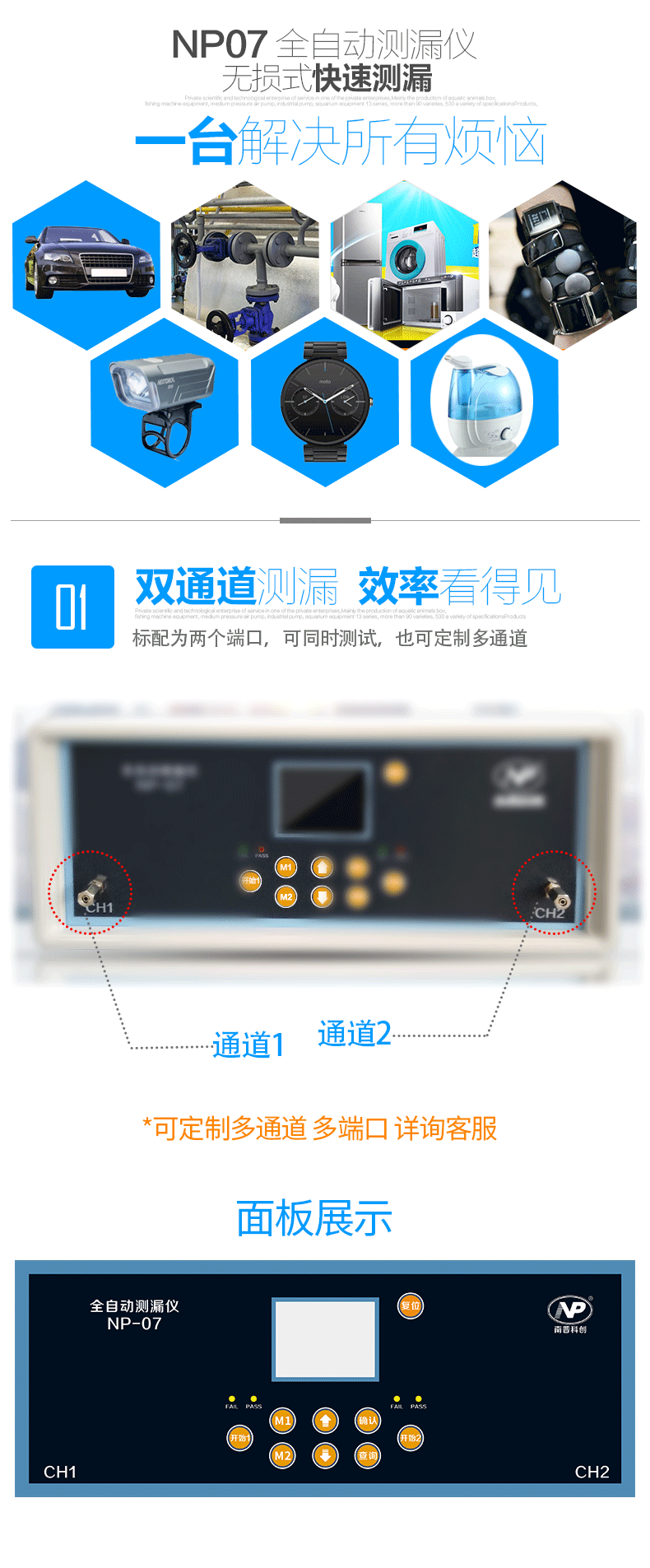 采用壓降法檢測(cè)原理,以壓縮空氣為介質(zhì)對(duì)產(chǎn)品檢測(cè),是一款無損檢測(cè)儀器。產(chǎn)品通用性強(qiáng),可檢測(cè)大,中,小泄漏。檢測(cè)精度高,操作簡單。傳感器方面,采購的高精度高穩(wěn)定性進(jìn)口傳感器,即保證的測(cè)試的精度,同時(shí)又經(jīng)濟(jì)實(shí)穗; 一款功能操作簡單,全自動(dòng)測(cè)試,客戶使用簡單方便(客戶只需要接氣、接電即可測(cè)試使用);超高性價(jià)比,超經(jīng)濟(jì)實(shí)穗的便攜式測(cè)漏儀;雙路測(cè)試,兩路同步測(cè)試(也可獨(dú)立分開測(cè)試)兩個(gè)產(chǎn)品,提高生產(chǎn)作業(yè)效率; 主要應(yīng)用需做防水檢測(cè)儀,防塵檢測(cè),漏氣測(cè)量,氣密性檢測(cè)儀的工業(yè)產(chǎn)品、民用產(chǎn)品等。 一、測(cè)試時(shí)間:產(chǎn)品測(cè)試時(shí),啟動(dòng)、充氣、平衡、測(cè)試、放氣等,時(shí)間可以進(jìn)行設(shè)置; 二、全自動(dòng)版:只需要接電、接氣源即可以測(cè)試使用; 三、實(shí)用性:同時(shí)2路測(cè)試,參數(shù)設(shè)置簡單,使用方便;聲光報(bào)警,控制輸出,可以配合自動(dòng)化控制; 四、原理說明:本測(cè)試儀利用加氣壓或負(fù)壓(抽真空)原理,測(cè)試氣壓衰減檢漏,真空衰減檢漏,氣閥開啟氣壓測(cè)試,對(duì)充氣產(chǎn)品,密封產(chǎn)品等各種形狀的容器進(jìn)行無損密閉性檢測(cè); 五、應(yīng)用范圍:適用于各行業(yè)有氣密性要求(或防水性要求,IP67、IP68防水測(cè)試)的產(chǎn)品進(jìn)行檢測(cè)試驗(yàn)(如:充氣產(chǎn)品,安全氣囊、閉氣產(chǎn)品,閥門、波紋管、管理氣路、焊接件、壓鑄件、智能手表、水壺、三防電子產(chǎn)品等)。