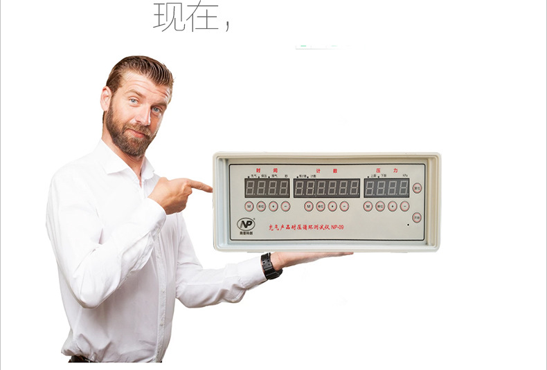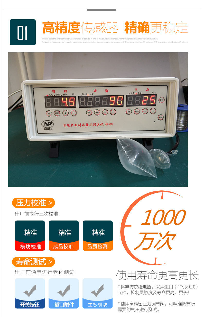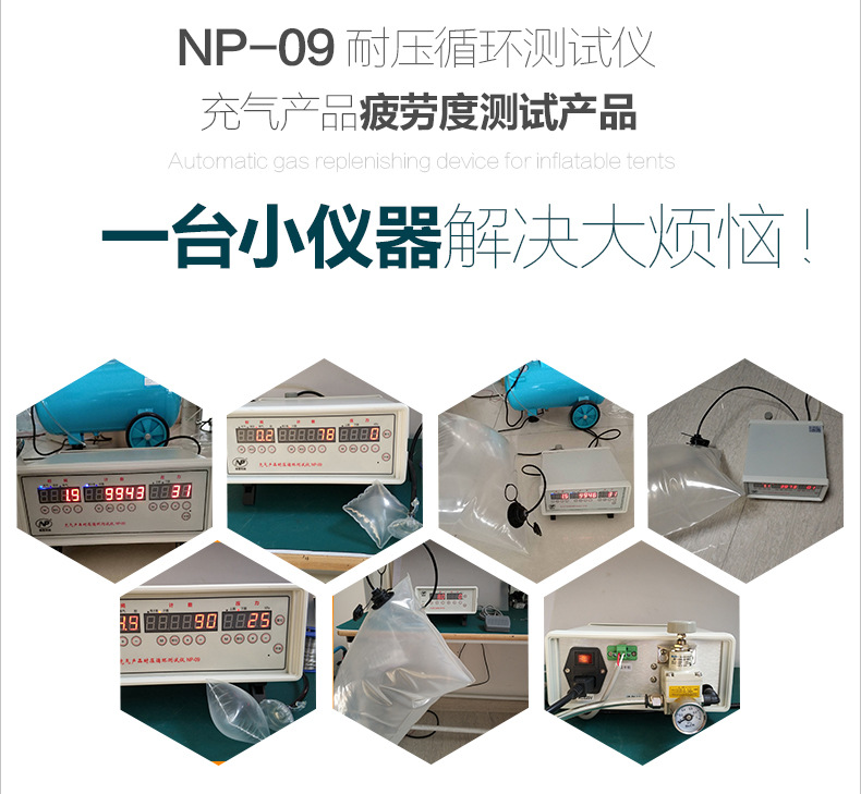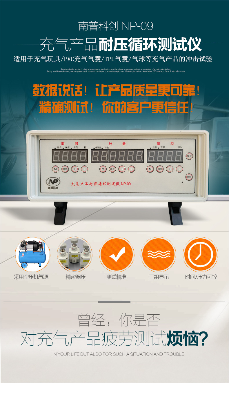 充氣產(chǎn)品耐壓循環(huán)測試儀NP09,采用,計時、計數(shù)、壓力系統(tǒng),應(yīng)用于充氣產(chǎn)品耐壓循環(huán)測試。時間:充氣時間,保壓時間,排氣時間,進行充氣相應(yīng)的系統(tǒng)控;壓力:設(shè)置壓力上下限,當超限時停止測試;計數(shù):測試次數(shù)記錄,即可以設(shè)定測試的次數(shù),也可以不設(shè)置,一直循環(huán)測試;